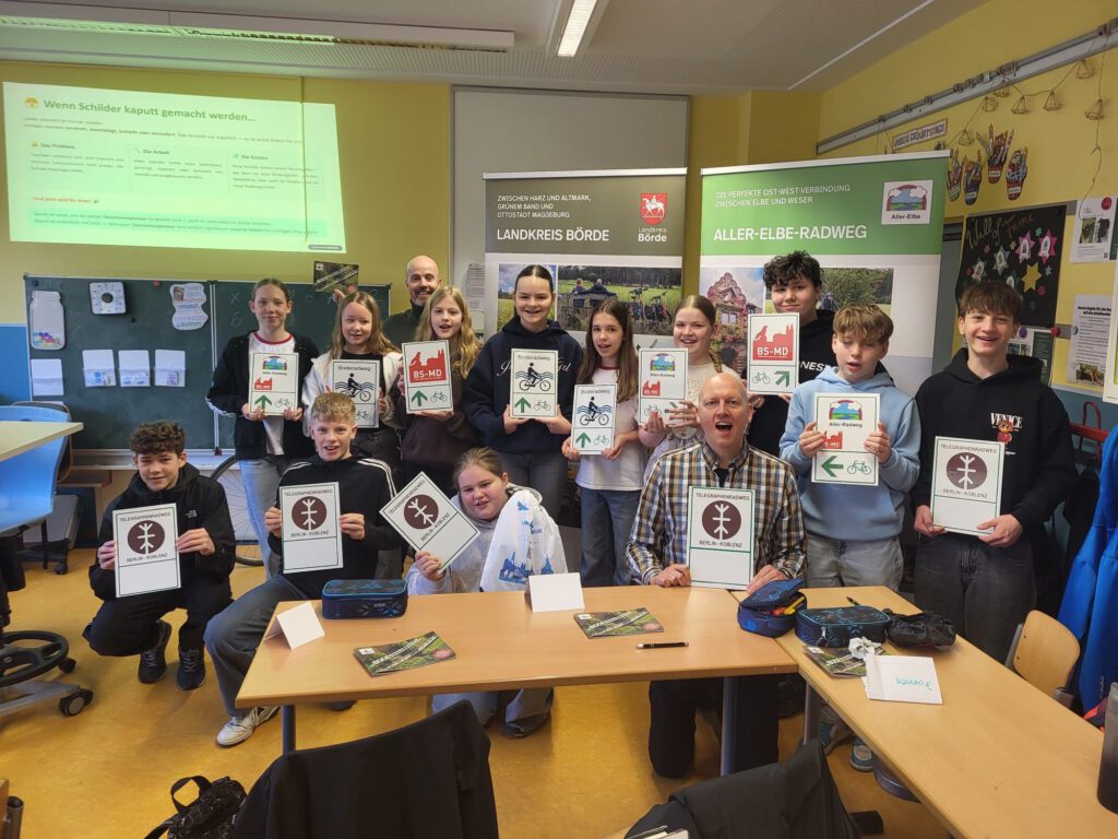 Am 19.03.26 besuchte der Tourismusmanager des Landkreises Börde, Tino Raguse, die Gemeinschaftsschule J. Gutenberg. Im Rahmen des Profilkurses Fahrrad/Technik führte er ein Mini-Projekt mit der Halbgruppe einer 6ten Klasse durch. Dabei gab es informative Impulse zur Bedeutung des Rad-Tourismus für den Landkreis Börde, zu den Aufgaben eines Tourismusmanagers im Allgemeinen und zum Bereich Radwege-Ausbau und Betreuung im Besonderen. Die Schüler durften in einer Vorabpräsentation Image-Filme begutachten und sich aktiv mit Informationen zu Tourismushighlights der Region auseinandersetzen. Im Praxisteil wurden Radwegschilder durch die Schüler beklebt, die auch tatsächlich zum Einsatz kommen werden.